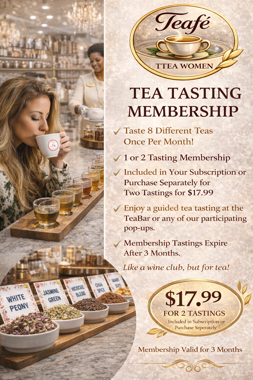 Tea at Teafé is more than a drink—it’s an experience. Our Tea Tasting Membership invites you to explore carefully curated blends through guided tastings at our tea bar or participating pop-ups. Discover eight distinctive teas each month, learn the stories behind the leaves, and engage your senses in a way that feels both indulgent and grounding. Whether you join through your subscription or purchase a tasting experience separately, this is an invitation to slow down, savor, and connect—one cup at a time.